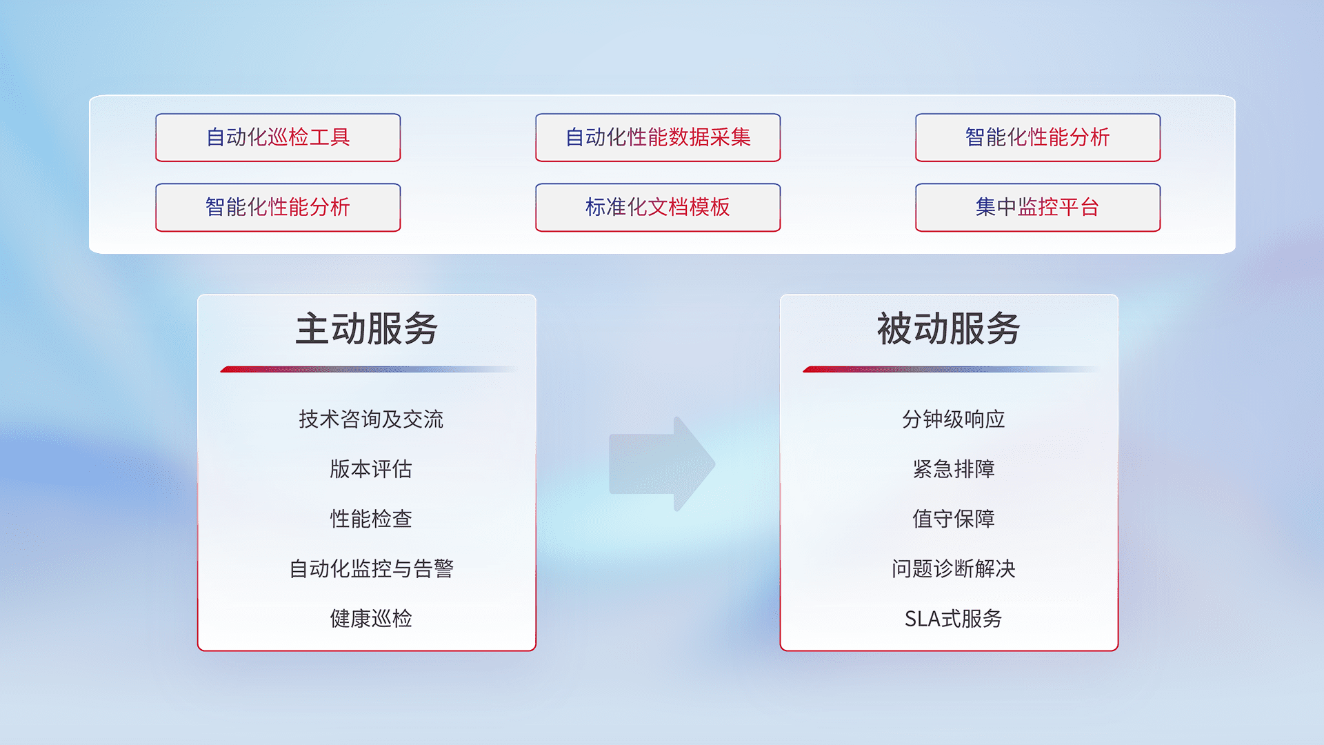智能化工具和标准化文档,,,保障服务质量,,,,提供主动服务(包含技术咨询、、、、版本评估、、性能检查、、、自动化监控与告警、、健康巡检)和被动服务包含(分钟级响应、、、、紧急排障、、值守保障、、问题诊断解决、、、、SLA服务)。。。